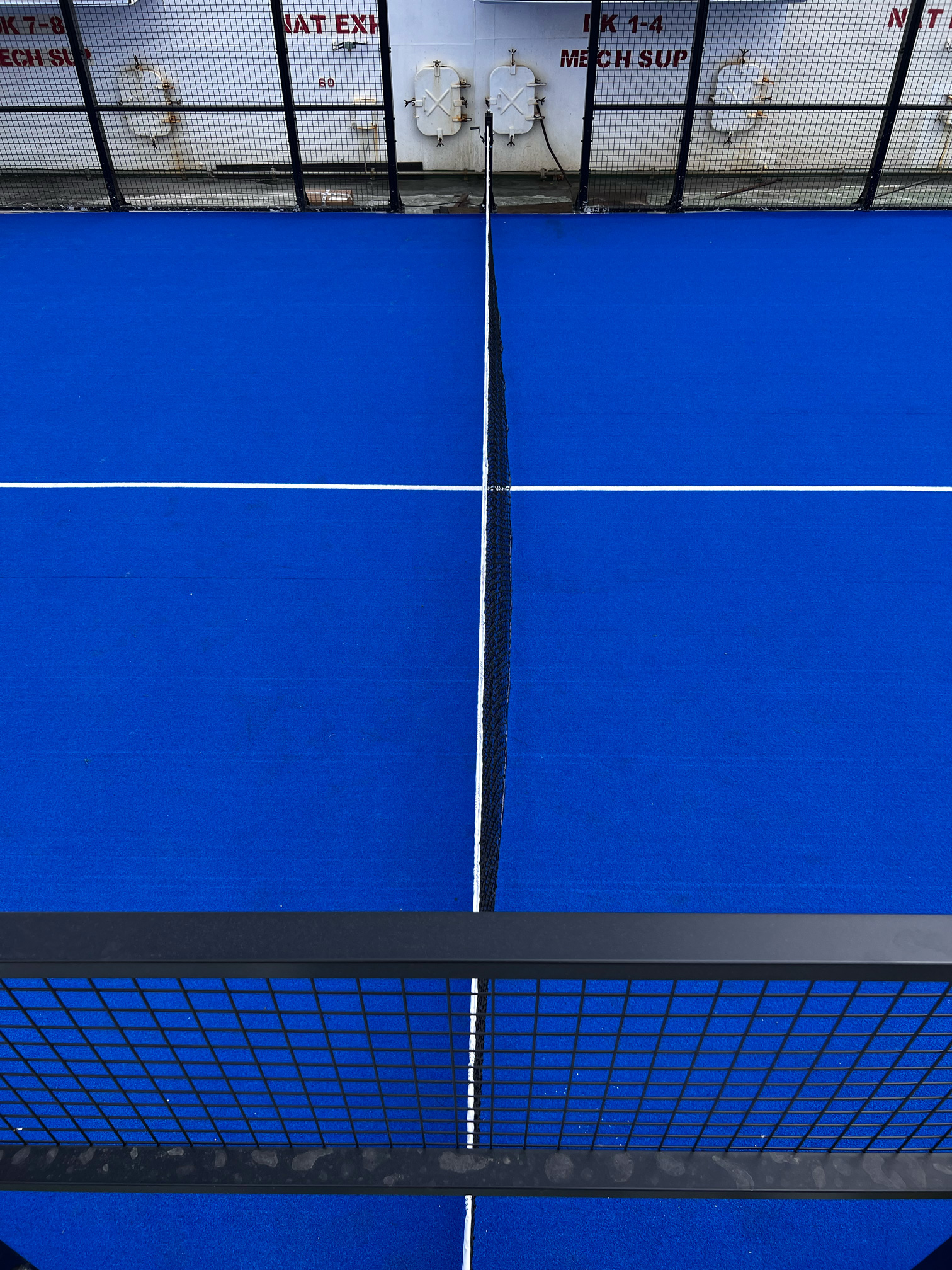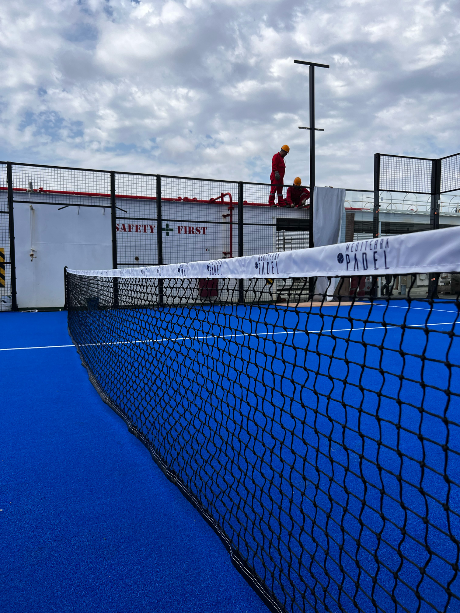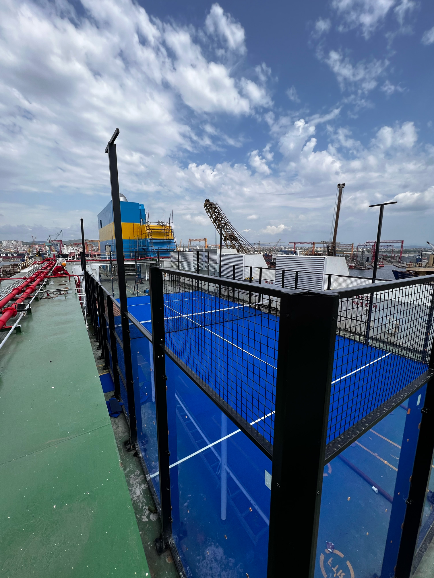 Mediterra Padel Global firmasıyla yürüttüğümüz en ilginç projelerden biri olan bu çalışmada, 250 metre uzunluğunda ve 50 metre yüksekliğindeki bir geminin güvertesine padel tenis kortu kurulumunu gerçekleştirdik. Kıtalar arası araba lojistiği yapan bu geminin sahibi, mürettebatın kullanımı için bu spor alanını yaptırdı. 200 metrekarelik açık alan üzerine kurulan padel tenis kortunun anahtar teslim sürecini 6 günde tamamladık. Bu proje, alışılmışın dışında mekanlarda dahi mükemmel çözümler sunabilme yeteneğimizi bir kez daha kanıtlamıştır.