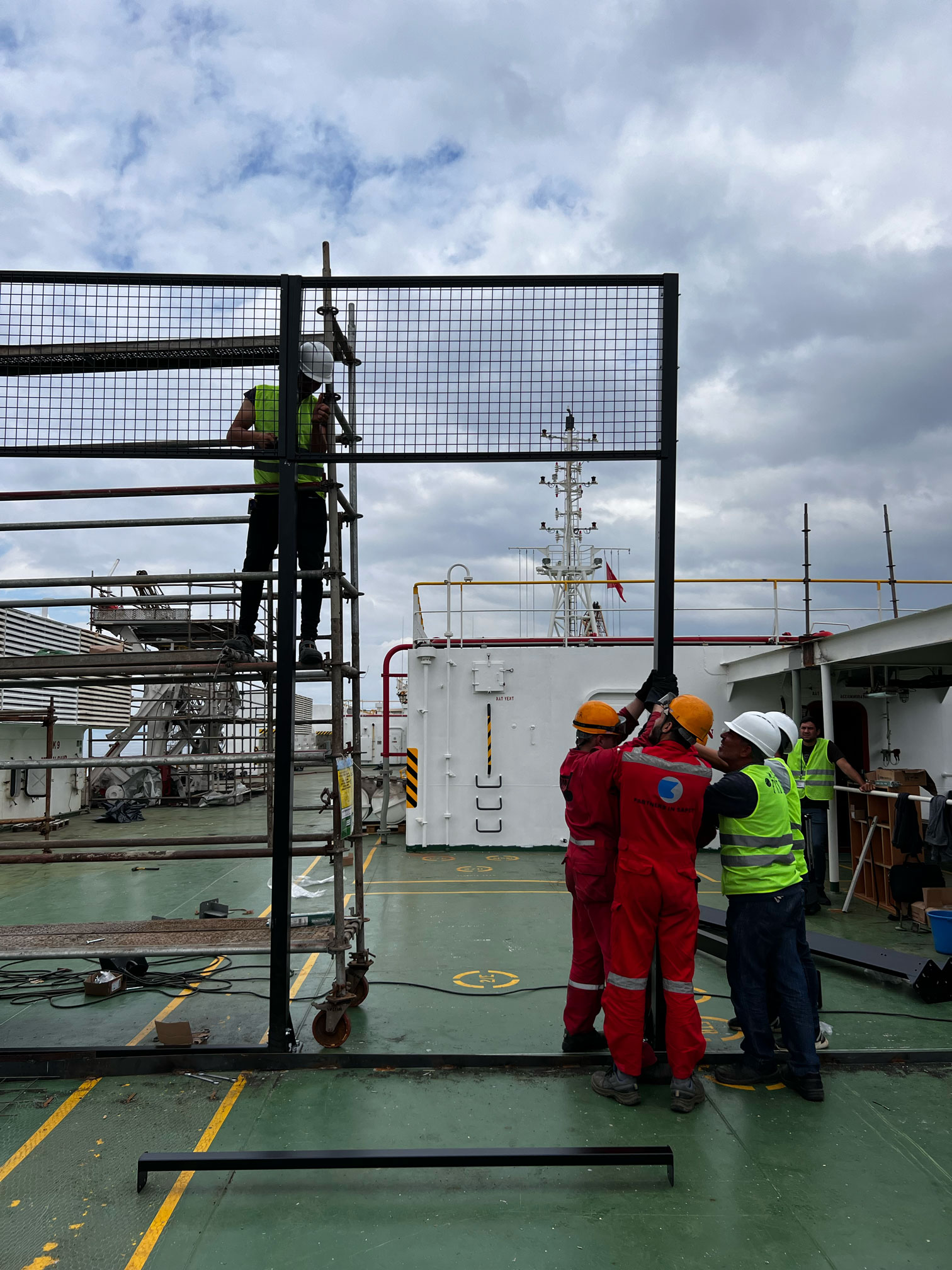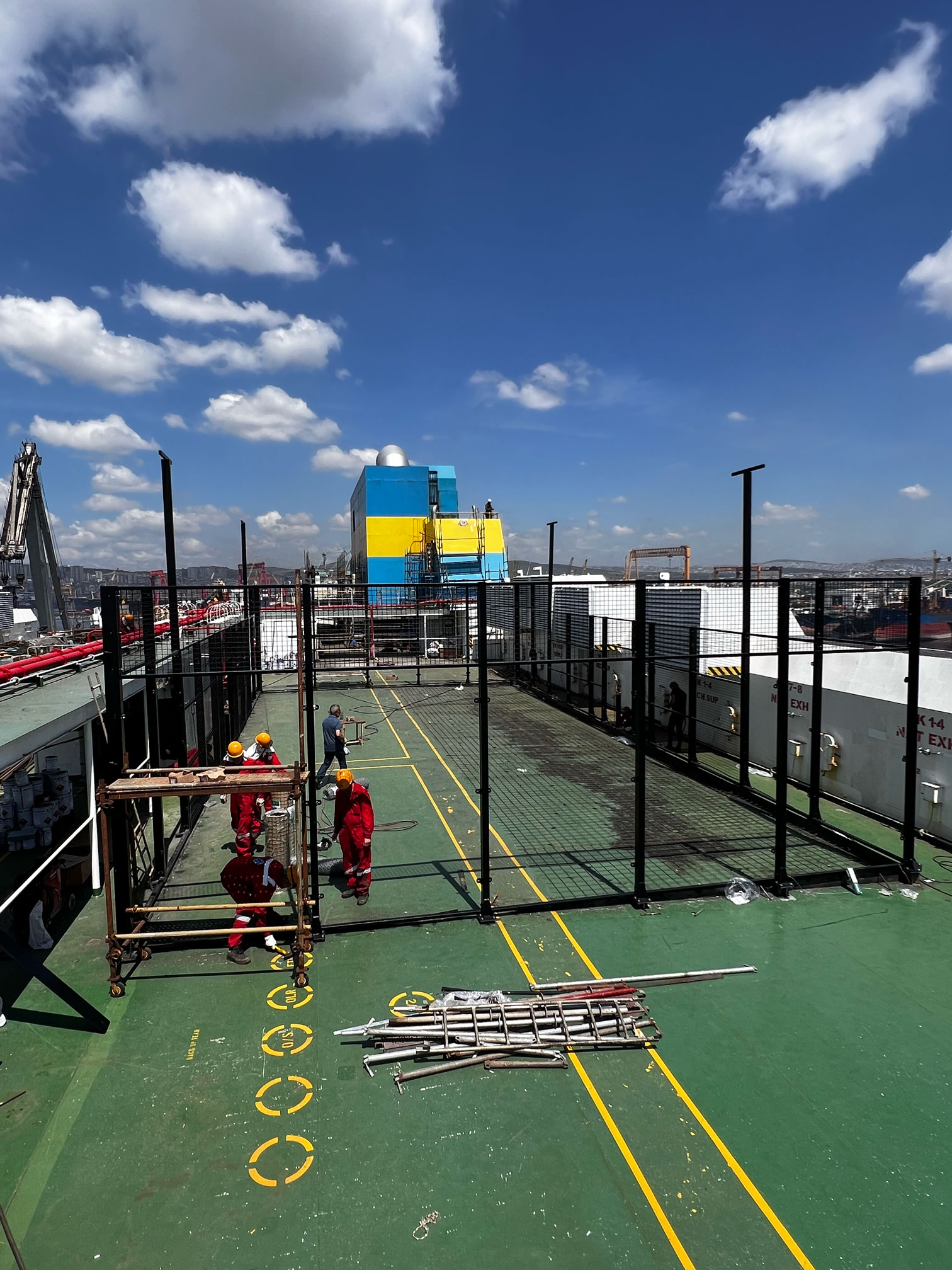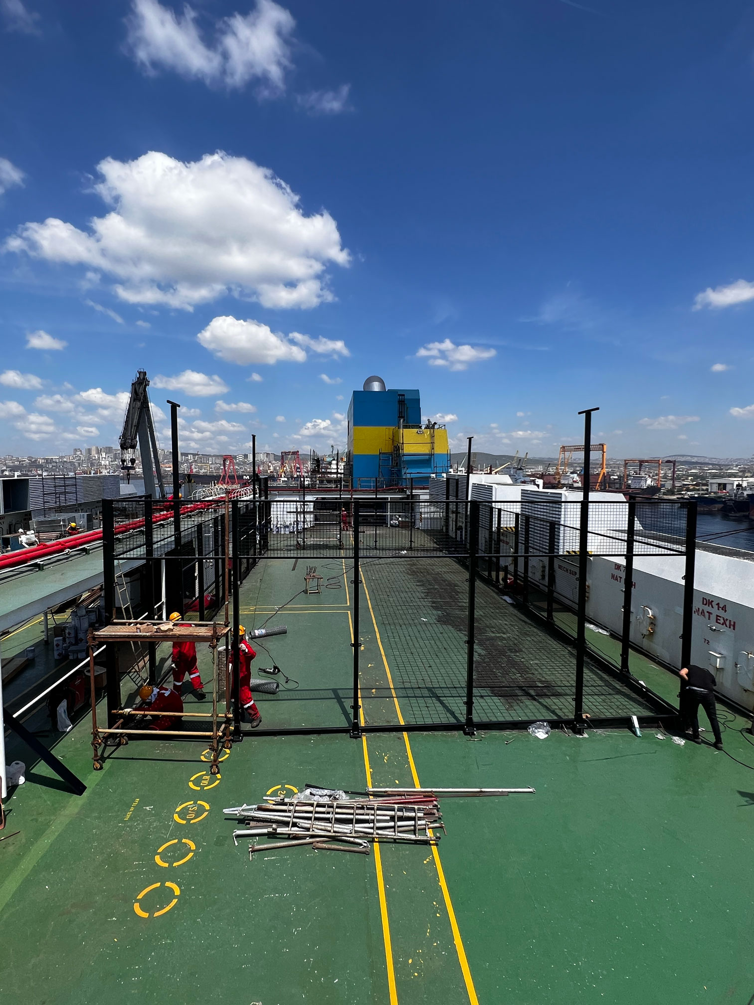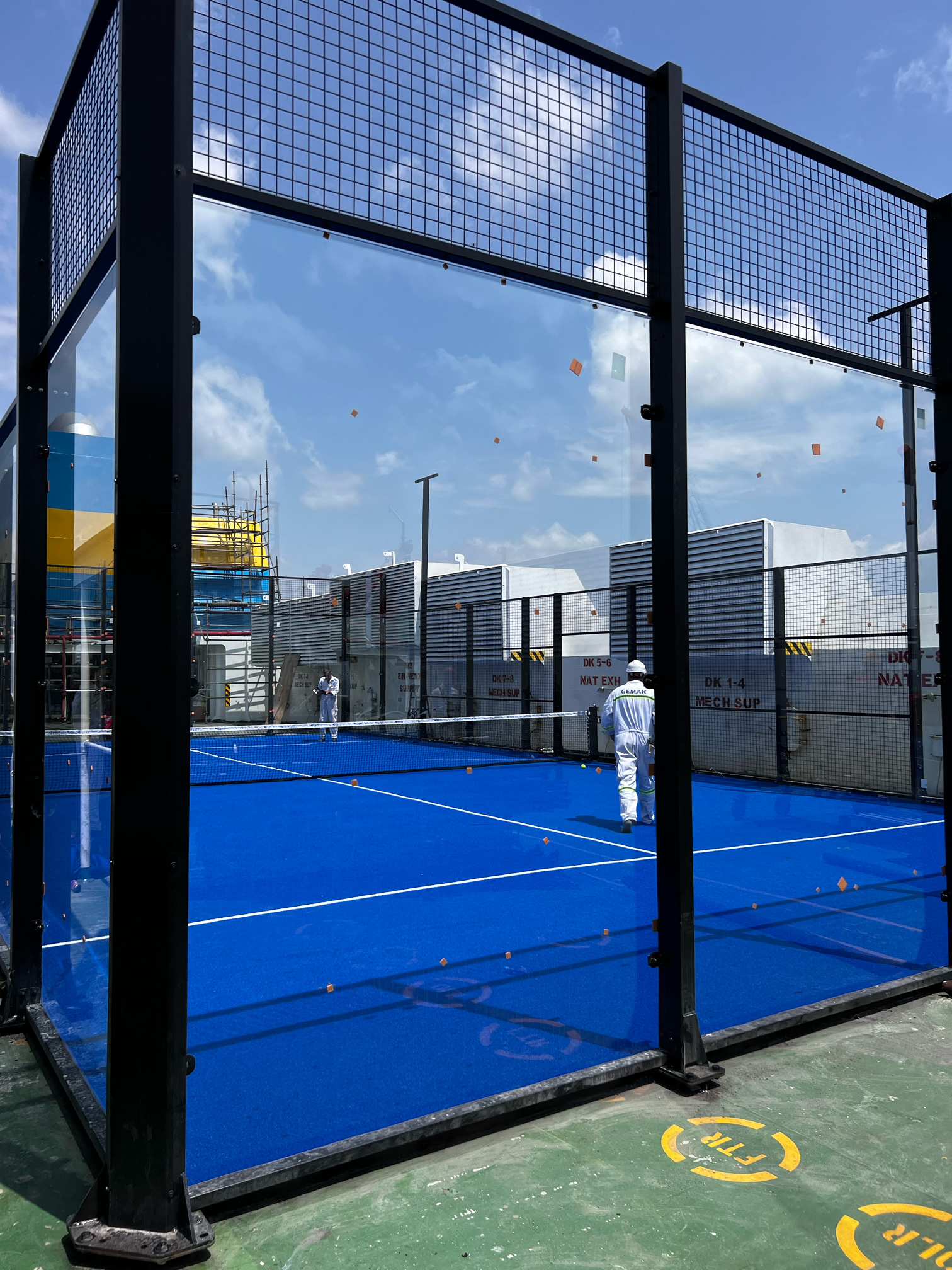 Mediterra Padel Global firmasıyla yürüttüğümüz en ilginç projelerden biri olan bu çalışmada, 250 metre uzunluğunda ve 50 metre yüksekliğindeki bir geminin güvertesine padel tenis kortu kurulumunu gerçekleştirdik. Kıtalar arası araba lojistiği yapan bu geminin sahibi, mürettebatın kullanımı için bu spor alanını yaptırdı. 200 metrekarelik açık alan üzerine kurulan padel tenis kortunun anahtar teslim sürecini 6 günde tamamladık. Bu proje, alışılmışın dışında mekanlarda dahi mükemmel çözümler sunabilme yeteneğimizi bir kez daha kanıtlamıştır.