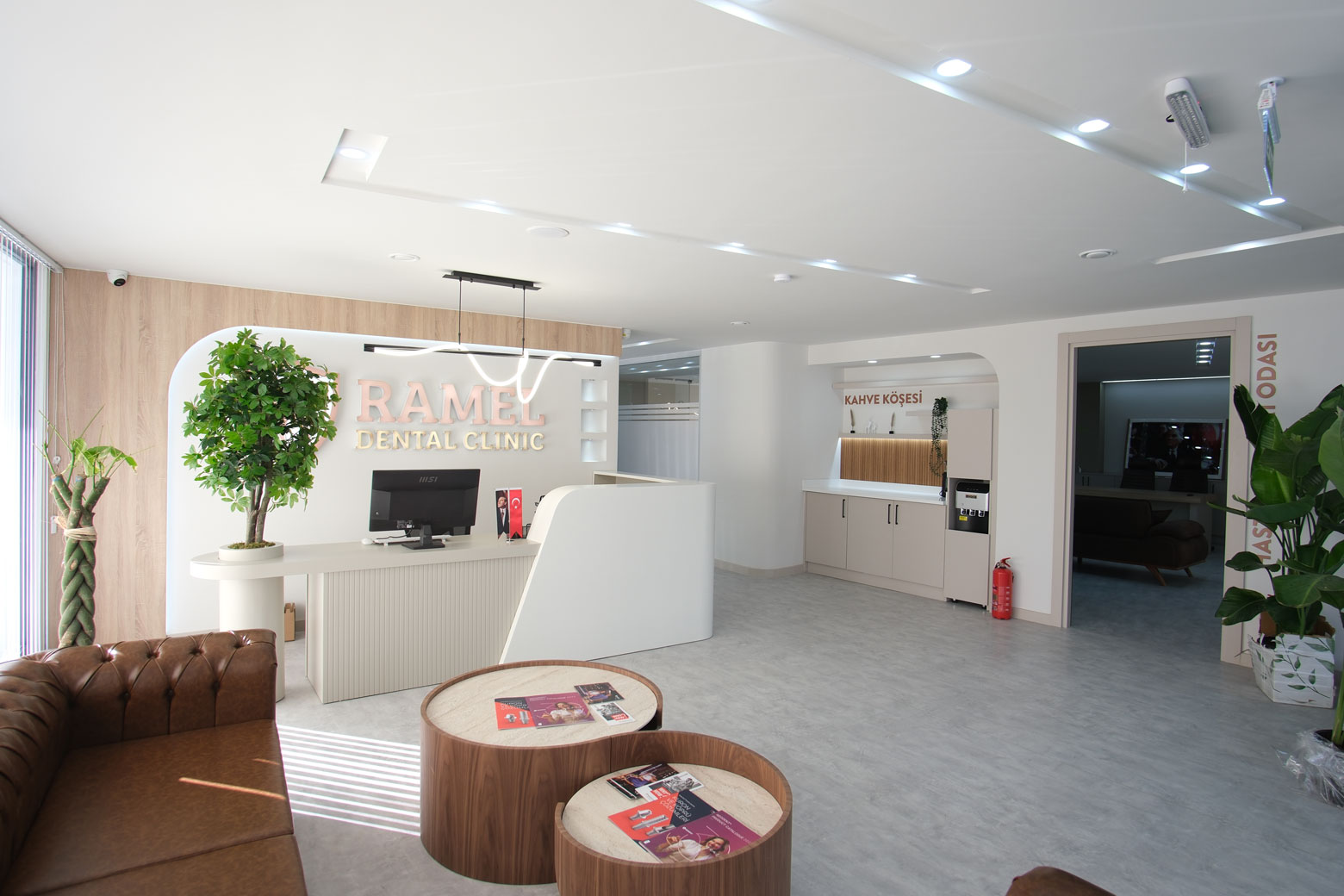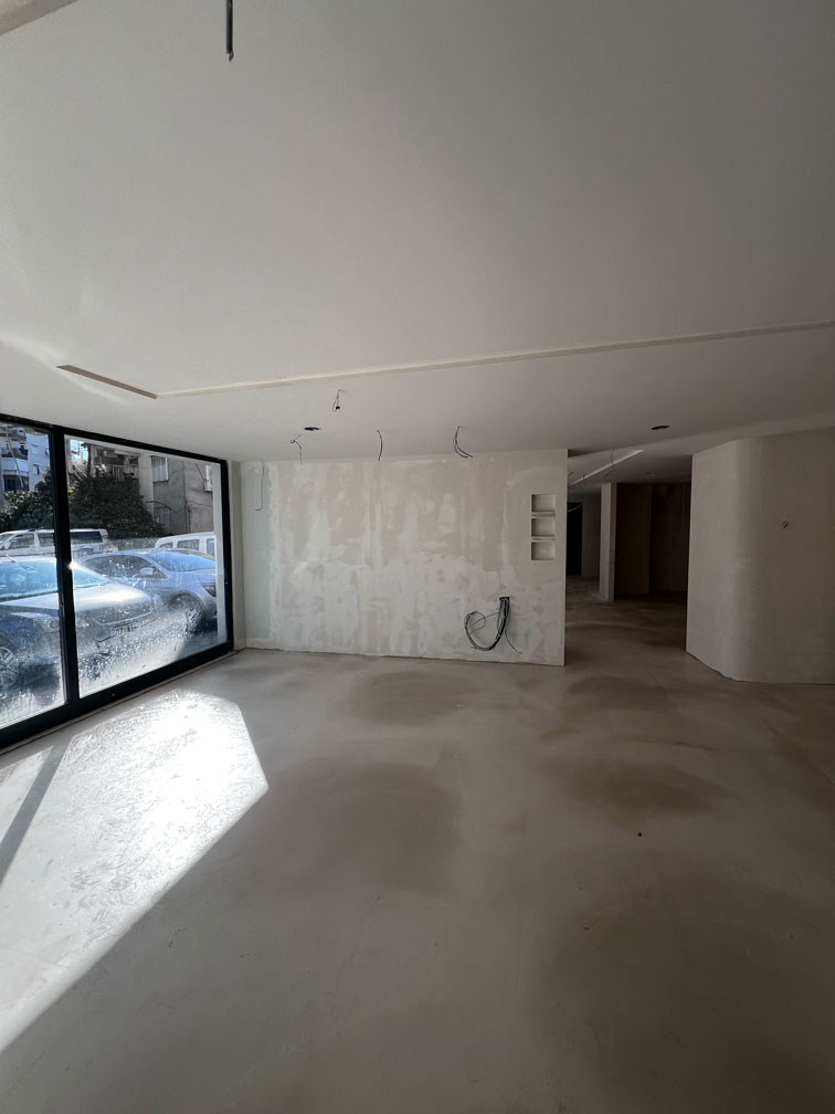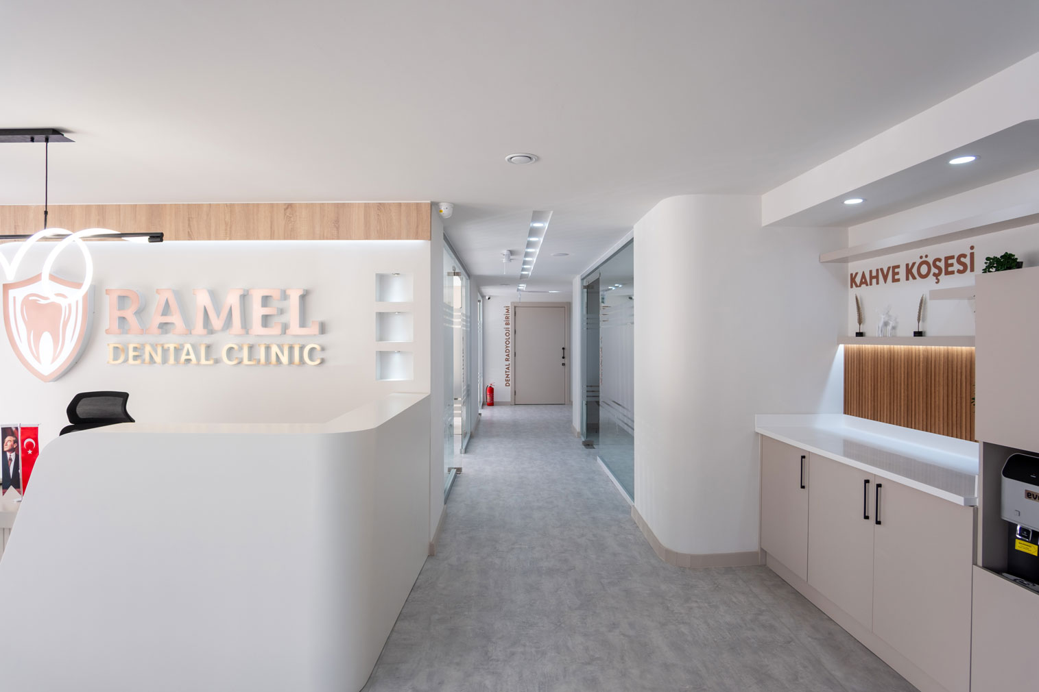 Mevcut seramik zemin üzerine uyguladığımız mikrobeton (microcement) zemin kaplama, kliniğe hijyenik, derzsiz ve modern bir atmosfer kazandırmıştır. Bu dönüşümde Ramel Dental, hastalarına kapıdan girdiği andan itibaren kurumsal ve güven veren bir deneyim sunacak şekilde tasarlanmıştır.